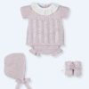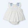 Abito in cotone, parte superiore in maglia con colletto in tulle ricamato in pizzo panna, parte inferiore in tulle con ricamo in pizzo panna