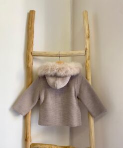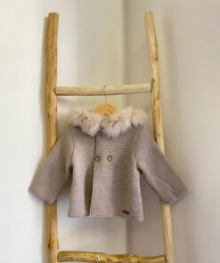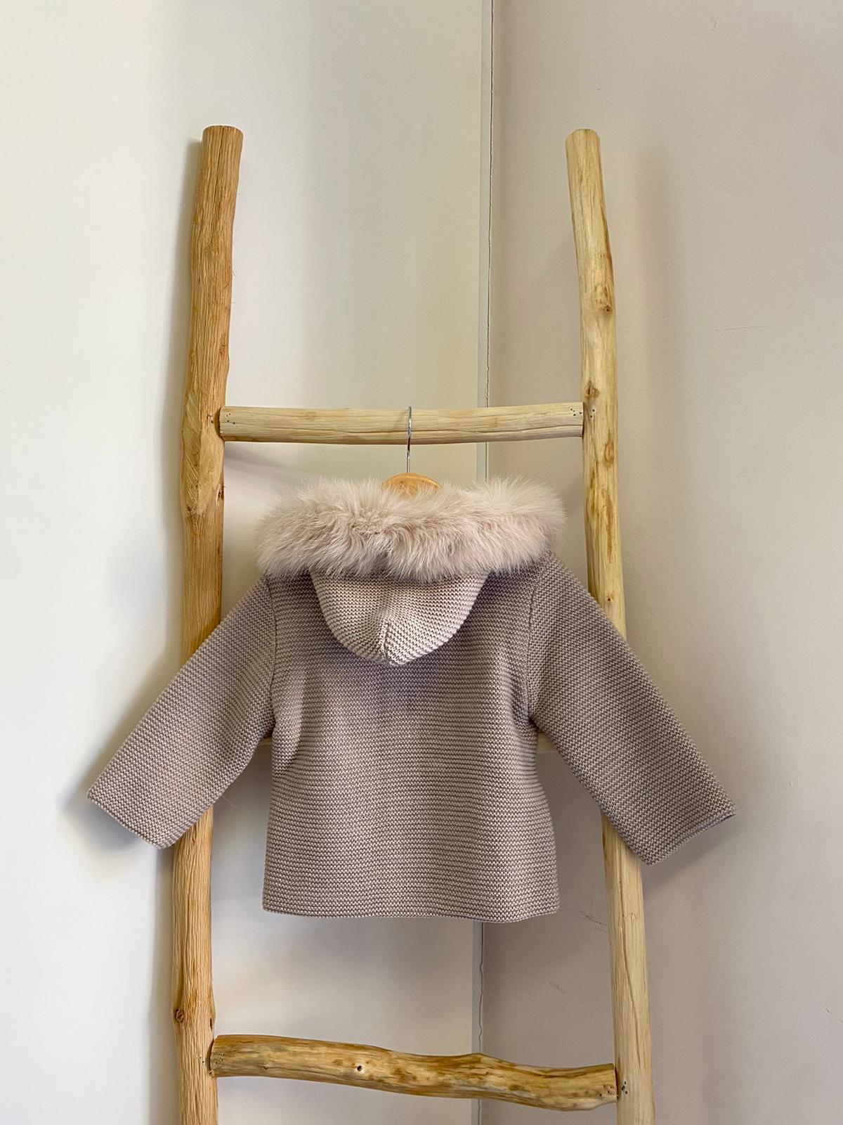 Cappottino in misto lana colore beige con cappuccio e pelliccia e bottoncini in cocco
