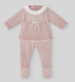 Completo 2 pezzi in cotone e cashmere rosa cipria con ricami e colletto bianchi