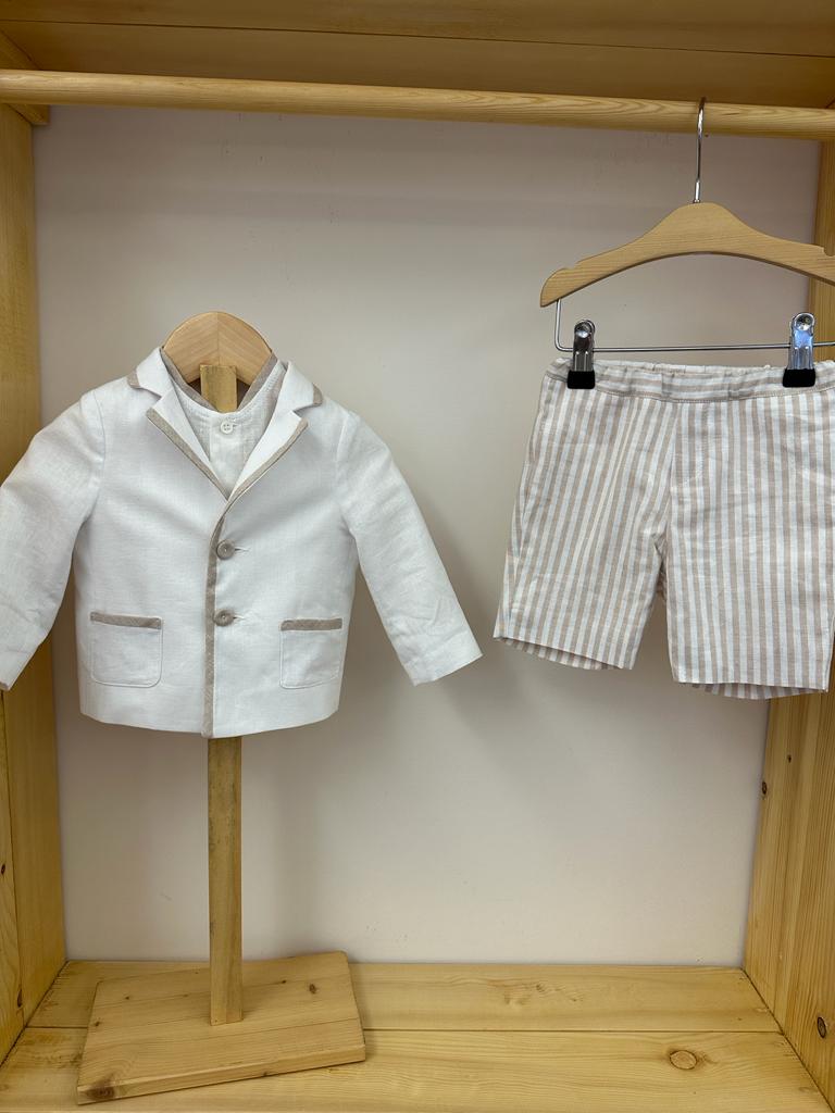 Completo Myrumi bimbo camicia, giacca e bermuda in lino bianco e beige