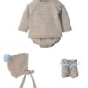 Completo tre pezzi Mac illusion in misto lana con: maglia e ghettina tortora con punto nocciolino celeste e cuffietta con pom pom.