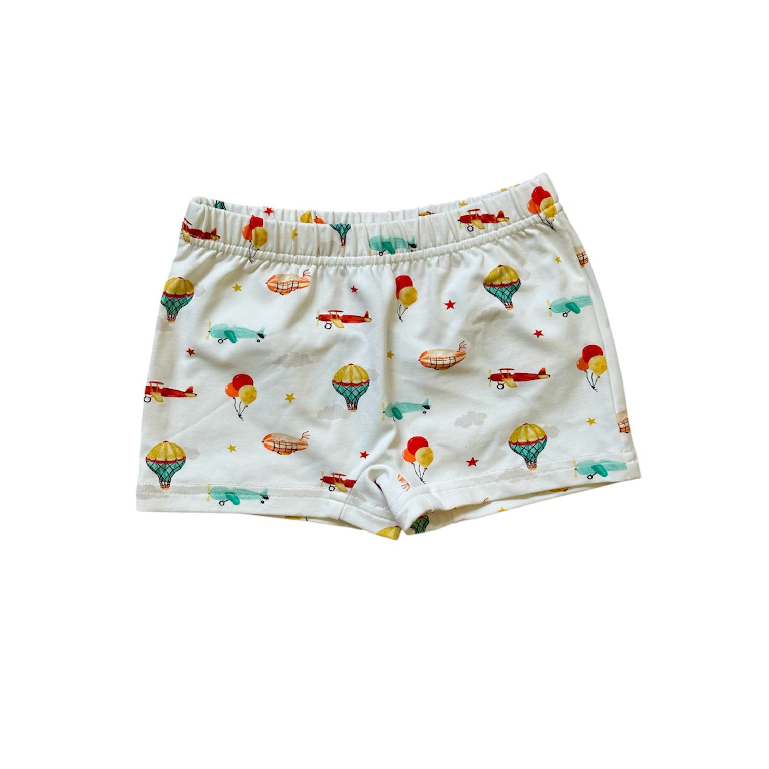 Boxer aderente bimbo, fondo bianco con stampa di aereoplani e mongolfiere, con elastico in vita