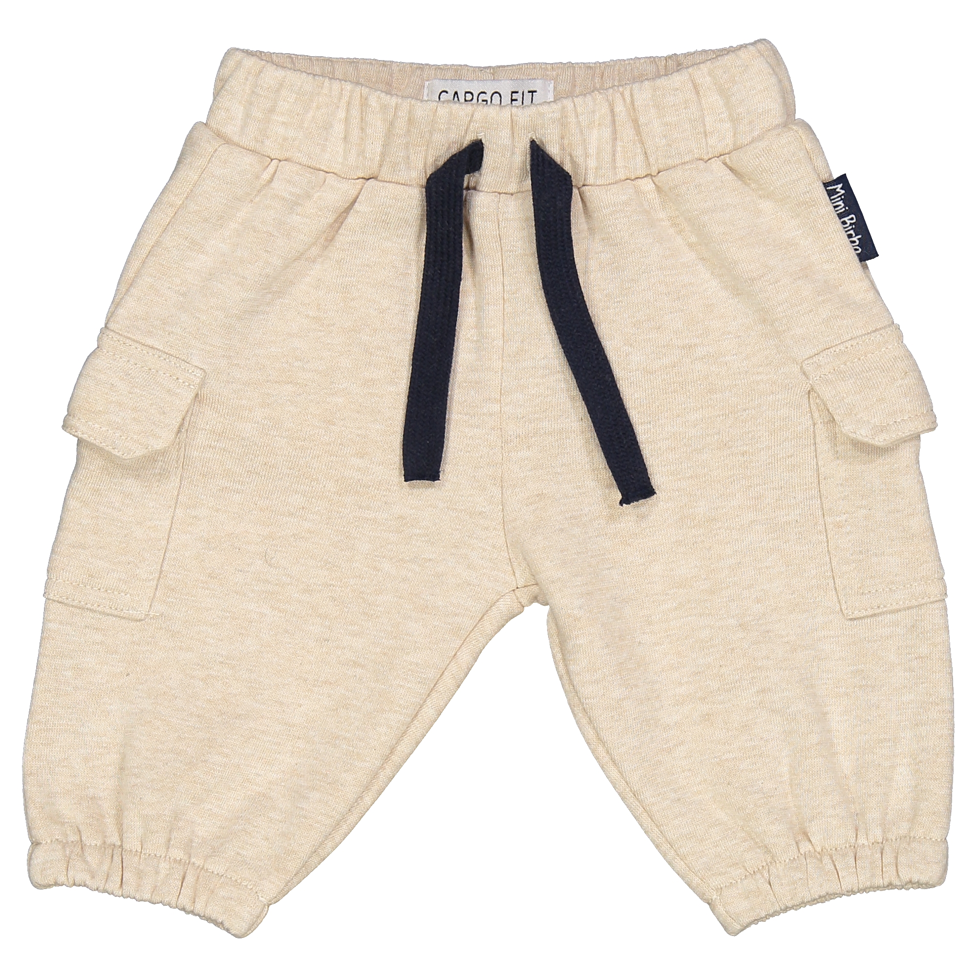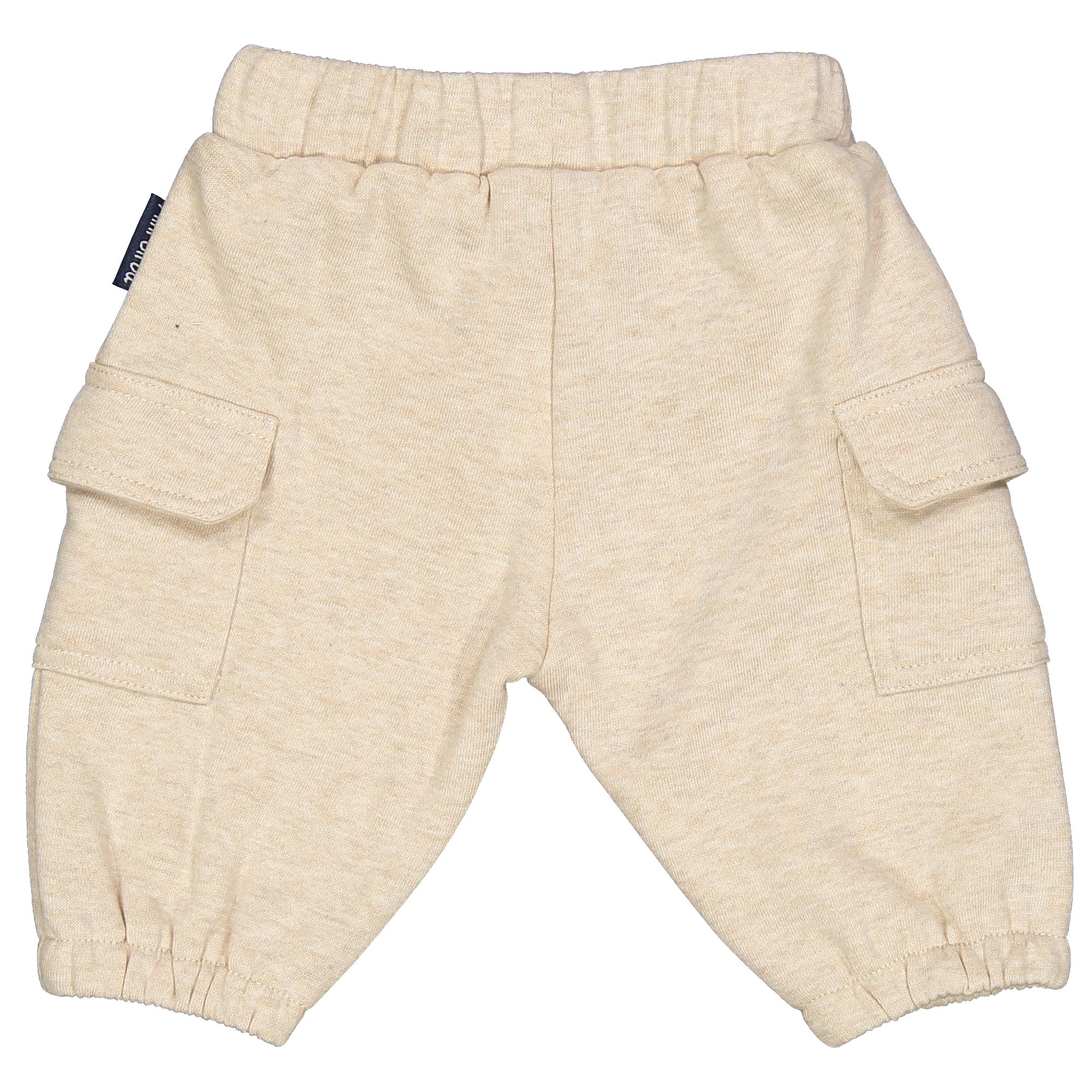 Pantalone in caldo cotone, colore beige con tasconi laterali e polsino, coulisse blu ed elastico in vita