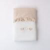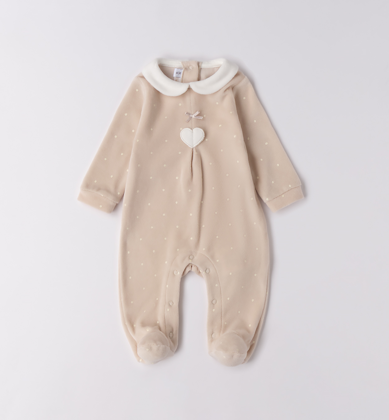 Tutina intera in ciniglia colore tortora con colletto e pois panna con applicazione cuoricino sulla parte anteriore e chiusura con bottoncini