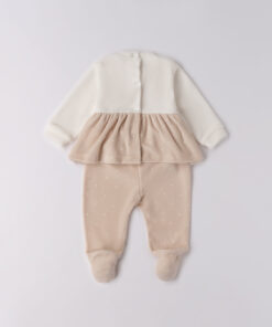 Tutina in ciniglia due pezzi: maglia bianca e tortora con applicazione cuoricino e fiocchetto e ghettina colore tortora con pois panna