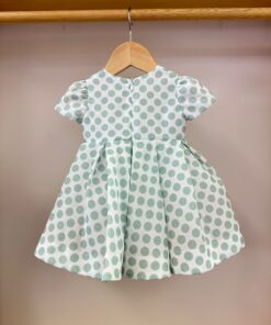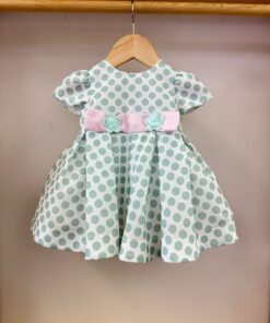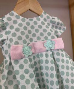 Vestito 100% cotone, colore bianco con pois verde acqua, mezza manica, cintura in vita con fiori verde acqua verde acqua e rosa, I Delfi